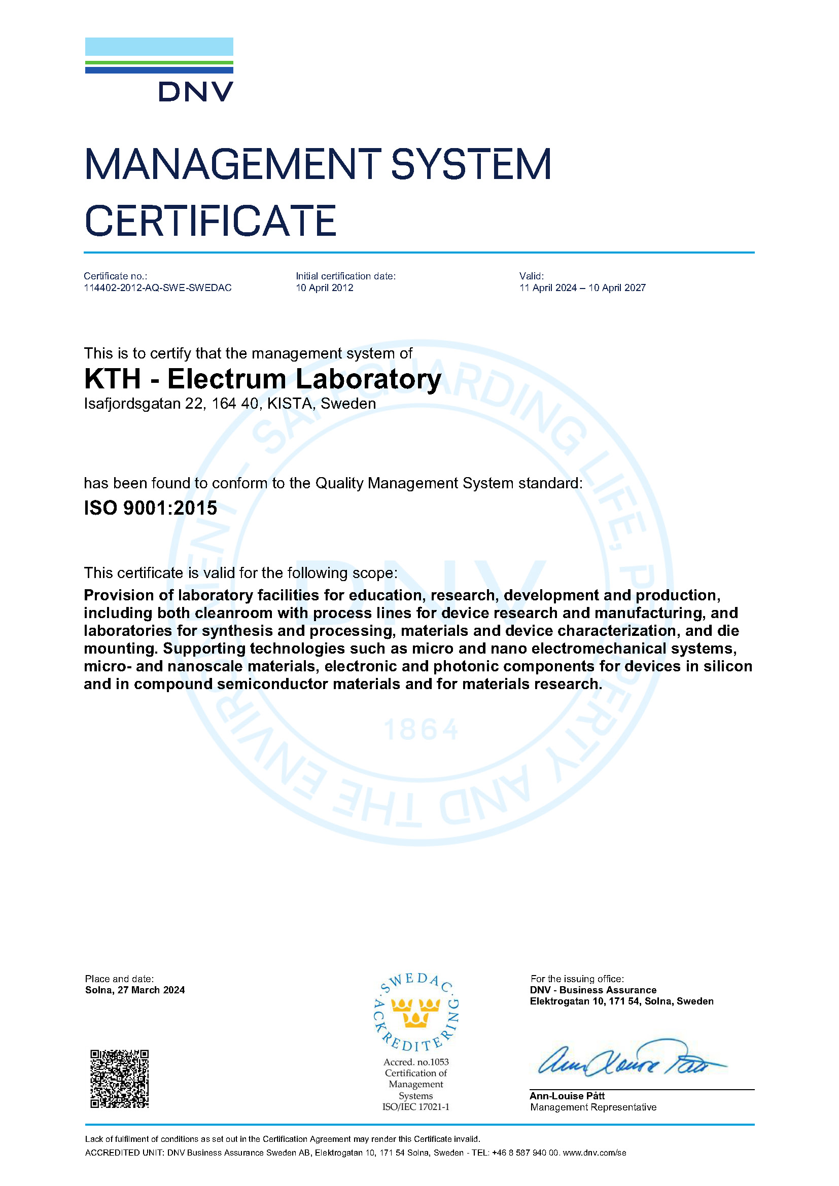 The Electrum Laboratory is part of the Royal Institute of Technology (KTH) which is certified according to the international ISO 14001:2015 Environmental Standard. |