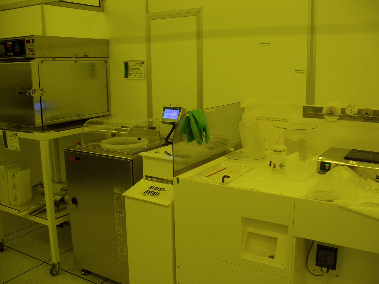 An EVG 620 UV Nanoimprint Lithography tool (left), mask aligner MA6/BA6 Karl Suss and a DSW g-line stepper is used for patterning the wafers.
